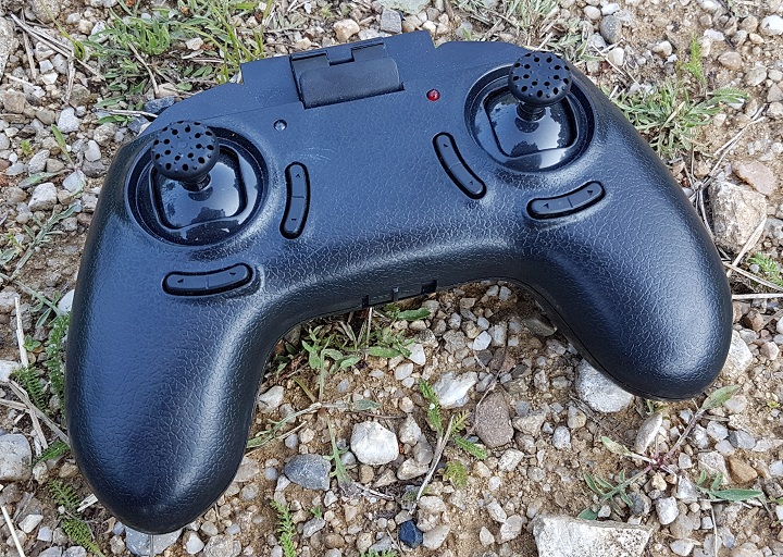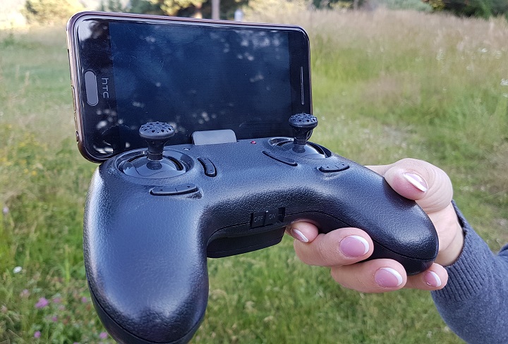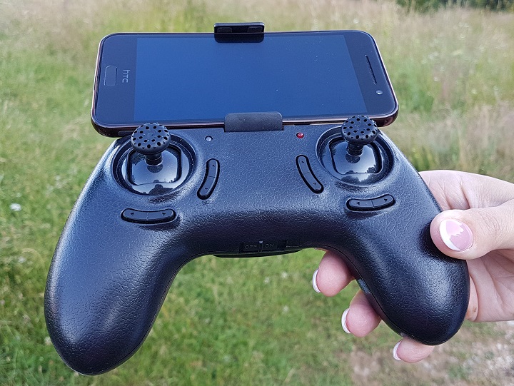 Lucrurile stau exact pe dos atunci când vorbim despre telecomandă. Pare realizată dintr-un plastic ceva mai ieftin, dar își face treaba. Nu are display, ca cea de la Overmax, însă poate adapta un smartphone (are un suport special construit pentru așa ceva) și poți avea imagini live direct pe telefon, prin intermediul unei aplicații dedicate. Asta este surpriza plăcută. Partea mai puțin plăcută este că aplicația dădea erori destul de dese și am renunțat ușor la această parte. Reconosc, a fost și din cauza fricii de a nu da cu telefonul de pământ, pentru că adaptorul pentru smartphone nu mi s-a părut foarte sigur. Și cumva legat de asta, atenție mare la modul în care fixați telefonul în locașul special gândit pentru asta. Inițial l-am pus pentru o vizibilitate mai bună, în forma de mai jos.