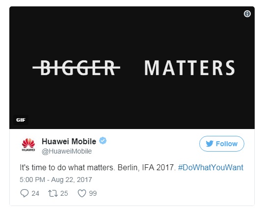 Huawei a postat pe contul oficial de Twitter un GIF animat în care atacă sloganul folosit de Samsung pentru Note8, “do bigger things”. Este tăiat bigger și în locul lui apare scris “do what matters”.