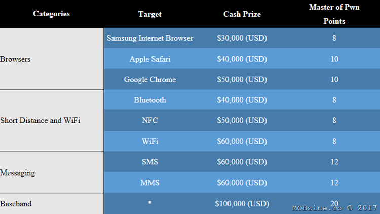 Modalitățile prin care aparatele puteau să fie compromise sunt de fapt căile clasice prin care comunicăm cu smartphone-urile: WiFi, mesagerie, browsing și partea de conectare GSM. Premiile potențiale au fost interesante.