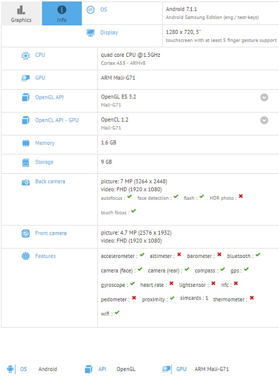 Terminalul este construit în jurul unui chipset necunoscut, dar care pare să fie nou în line-up-ul Exynos (pentru că vine cu un GPU Mali-G71) cu procesor quad-core, ajutat de o memorie RAM de 2 GB și de o capacitate internă de stocare de 16 GB, care poate fi extinsă prin microSD. Un Android 7.1.1 Nougat, un display HD de 5 inchi și proporție clasică, 16:9, o cameră foto principală de 8 megapixeli și una frontală de 5 megapixeli completează lista cu specificații care merită evidențiate.