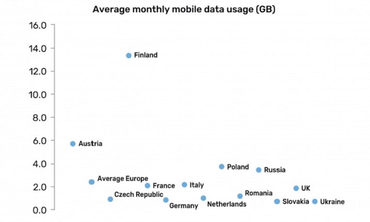 Topul este dominat de Finlanda, o țară în care pentru fiecare abonament de telefonie mobilă se consumă lunar 13,3 GB de date. Mai bine de dublul Austriei, care se plasează pe locul al doilea, cu o medie lunară de 5,7 GB trafic. Cum se plasează și alte state europene în acest top, vedeți în infograficul de mai jos.