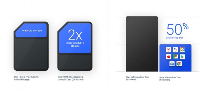 Este vorba despre un telefon care va folosi sistemul de operare Android Oreo Go Edition, cel pe care Google l-a promovat ca fiind extrem de eficient în consumul de resurse hardware și extrem de grijuliu cu memoria telefonului, având inclusiv aplicațiile eficientizate pentru a ocupa cât mai puțin spațiu. Astlfe, spun specialiștii de la Google, vom putea avea telefoane cu doar 1 GB de memorie RAM (poate chiar mai puțin) și cu 8 GB capacitate internă de stocare, care vor lăsa suficient spațiu la dispoziția utilizatorului. Cred că imaginea de mai jos este suficient de grăitoare în legătură cu mesajul pe care vor cei de la Google să îl transmită.