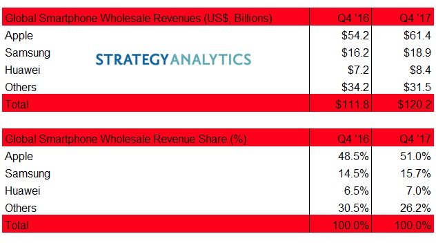 Lucrurile sunt destul de clare atunci când vine vorba despre veniturile din piața globală de smartphone. Apple reușește să domine topul producătorilor realizat în funcție de veniturile încasate, în principal datorită prețurilor mari de vânzare. Astfel, în cel de-al patrulea trimestru al anului 2017, Apple a reușit să atragă 51% din veniturile generate de vânzările de smartphone la nivel global, cu mult peste cei 15,7% ai coreenilor de la Samsung, aflați pe locul al doilea. Asta s-ar traduce în venituri de 61,4 miliarde dolari pentru Apple în acea perioadă, comparativ cu cei 18,9 miliarde dolari ai Samsung. Cifrele provin dintr-un studiu realizat de Strategy Analytics.