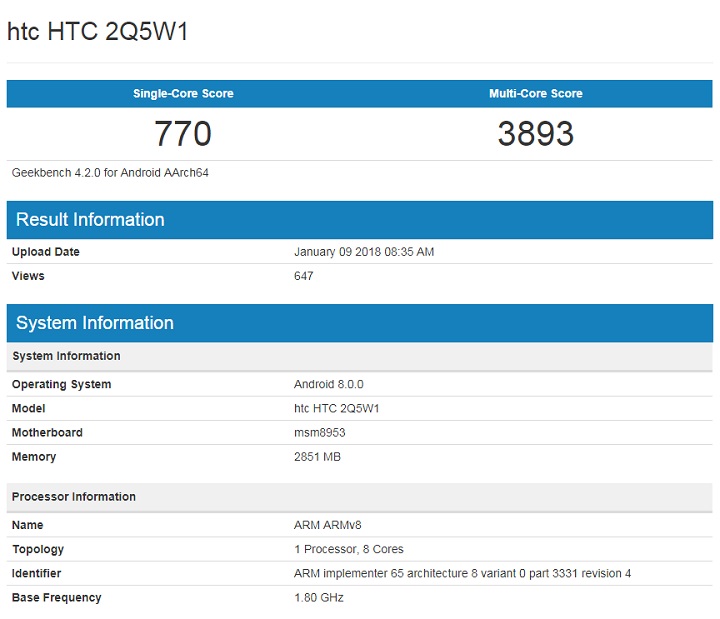 Unul dintre cei care îmbrățișează această teorie este și Roland Quandt, un celebru leakster. Se bazează pe detaliile lăsate în Geekbench, detalii care vorbesc despre un chipset Qualcomm Snapdragon 625, o memorie RAM de 3 GB și un sistem de operare Android 8.0 Oreo. Ba chiar se merge cu speculațiile până la a-i atribui telefonului chiar și un nume. HTC U11 Lite s-ar putea numi el.