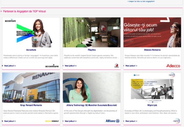 Câteva dintre companiile care participă la această ediție Angajatori de TOP Virtual sunt: Grup Renault România, Michelin România, Raiffeisen Bank, Accenture, Ericsson, Federal Mogul Motorparts, Nestle, PepsiCo, Auchan, Ubisoft, DB Global Technology, Societe Generale European Business Services, JTI România, HP Inc, Philip Morris România, KMG Rompetrol, Adecco, FINASTRA, IKEA, Flex, HELLA, Nokia, Rewe Penny, Wipro LTD, Wipro Automotive Excellence Center, Carrefour, DB Schenker SSC, Amoma.com, Harman, Adient, Yazaki Component Technology, BCR, Genpact, Kellogg’s, Coca-Cola HBC România, Vodafone România, McDonald’s in Romania, DXC Technology, Oracle, Microsoft, TBI Bank, Nobel, G2-Travel, ProCredit Bank, SAP România, Henkel, Bitdefender, Computer Generated Solutions România, BearingPoint România, AMAZON, Telus International Europe, Allianz Technology, Kaufland România, DEUTSCHE TELEKOM SERVICES EUROPE – ROMÂNIA, Cameron, British American Tobacco, Lidl România, Veeam Software, Photo Hotel, Blue Projects, Playtika, Automatic Data Processing (ADP) România.