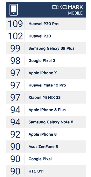 Topul DxOMark este în continuare dominat de Huawei P20 Pro, cu 109 puncte, urmat de Huawei P20 cu 102 puncte și de Samsung Galaxy S9+, cu 99 puncte.