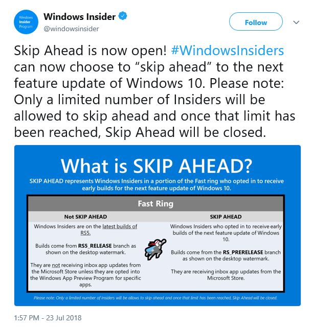 Odată cu build-ul 17713 de Windows 10 Insider Preview Microsoft a anunțat și că face schimbări legate de Skip Ahead Ring, în acest fel dându-i afară pe toți cei care erau în program și relocându-i în Fast Ring.