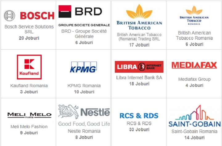 30 de companii de top cauta juniori cu 0-3 ani experienta, studenti sau proaspat absolventi. Dintre acestea amintim: Bosch Service Solutions, BRD – Groupe Societe Generale, British American Tobacco Trading SRL, British American Tobacco Romania, Kaufland Romania, KPMG Romania, Libra Internet Bank, Mediafax Group, Meli Melo Fashion, Nestle Romania, RCS&RDS, Saint-Gobain Romania, Schneider Electric, Team Extension, Ubisoft Romania, WEBHELP Romania, Bookster, Brainspotting, Catalyst Solutions, DB Schenker Global Services Europe, ExperBuy, Goodyear Dunlop Tires Operations, GroupM, HeidelbergCement România, Hilti Romania, KOTON, LOJA FRUCTELOR/SLooP, OTP Advisors, Universum Events, Vodafone Shared Services Romania, WALTER GROUP Austria si Ziarul Bursa.