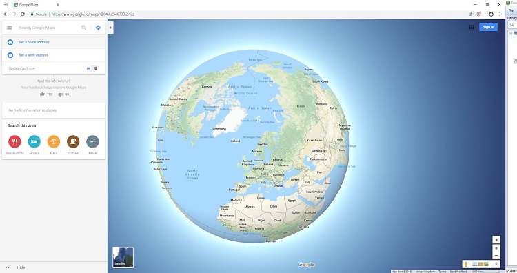 Odată cu cel mai nou update pentru Googl Maps, utilizatorii de desktop pot experimenta acum o nouă modalitate de a privi Pământul, sub forma unui glob. Se întâmplă atunci când harta e mărită la maxim și Pământul nu mai e prezentat ca fiind plat, ci sub forma sa rotundă.