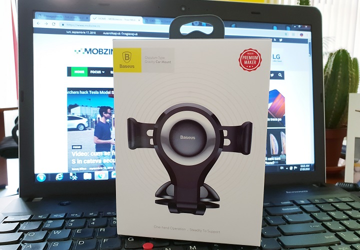 Ca o scurtă paranteză, am testat un suport auto Baseus Gravity Black, care costă 36 de lei pe MobileDirect. Însă pe cutia acestui produs vedem că sunt disponibile și alte culori, așa că oferta magazinului online trebuie consultată cu atenție.