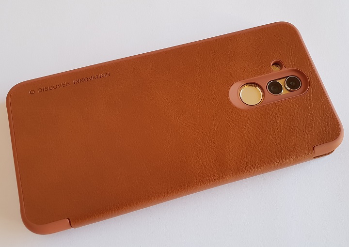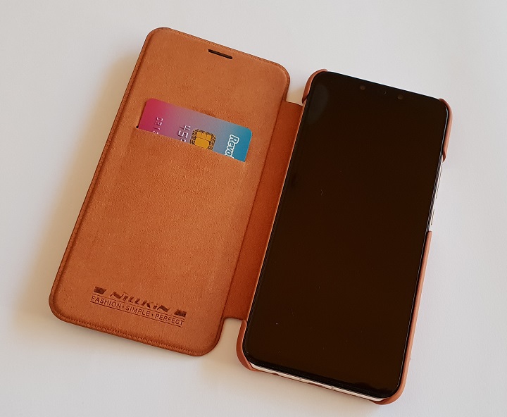 Următoarea propunere este pentru cei care vor un aspect mai elegant și încearcă să obțină un grad mai mare de protecție. Este o husă de tip cover, Nillkin Qin Brown, care se închide și peste display-ul telefonului.