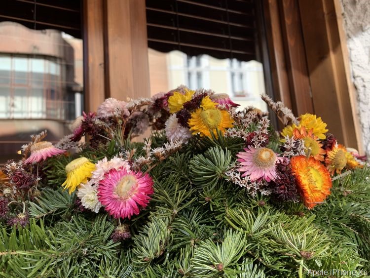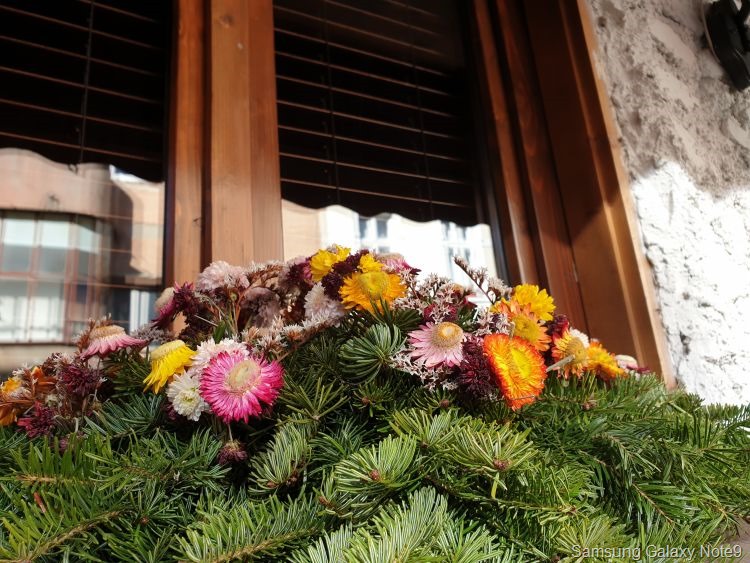Pentru că este o toamnă târzie și nu am avut acces la flori de la care să pot fotografia o varietate de culori naturale am decis că pentru testul de combinație de culoare să iau acest aranjament din Piața Enescu din Brașov. Are avantajul că pe fundal avem și un frumos maro al lemnului.