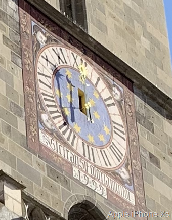 Folosind camera principală am realizat pozele de mai jos, cu focalizare pe ceasul de pe turlă, aflat în soare direct. Urmăriți și modul de reprezentare a culorilor cerului și al pietrelor din construcția bisericii.