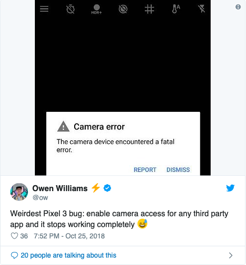 De câteva zile este raportată o problemă majoră ce a lovit seria de smartphone-uri Google Pixel 3 și anume blocarea camerei dacă aceasta este accesată folosind aplicații terțe și nu Camera preinstalată de Google pe Android. În condițiile în care camera foto este unul dintre atu-urile lui Google Pixel 3 informația conform căreia aceasta devine nefuncțională dacă este accesată cu aplicații terțe gen Instagram sau Facebook nu are cum să facă bine vânzărilor.