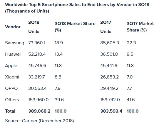Cei de la Gartner au publicat rezultatele unui studiu despre vânzările de smartphone la nivel global în cel de-al treilea trimestru al anului 2018. Avem o piață care la nivel total nu s-a mișcat prea mult (s-a înregistrat o creștere de doar 1,4% față de perioada similară a anului trecut), însă dinamica din rândul principalilor jucători a fost destul de intersantă.