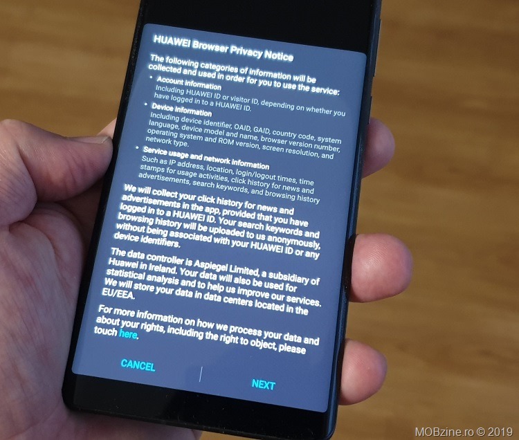 Unul dintre lucrurile pe care am dorit să le schimb pe noul Huawei P30 Pro (venit de la Orange prin programul Orange Smartphone Tester) este browser-ul implicit. Huawei s-a gândit că e momentul să înceapă să colecteze (oficial) mai multe date despre utilizator și vrea să facă asta prin introducerea ca browser implicit a unei aplicații terțe (Browser îi spune) setată ca navigator standard. Partea bună este că la prima pornire prezintă o informare legată de ce date vor fi colectate și trimise către compania mamă, printre ele afându-se IP-ul, ID-ul Huawei (cine are), tipul de telefon, locația și istoricul de browsing, clicurile, timpii de folosire etc.