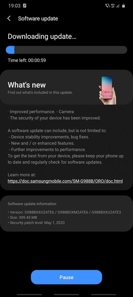 Firmware-ul G988VXXU2ATE6/G988BOXM2ATE6/G988BXXU2ATE3 pentru seria Samsung Galaxy S20 Ultra este disponibil de acum și pentru aparatele din România iar odată cu patch-urile de securitate Android pentru luna mai 2020 vine și cu un nou mod ”close-up zoom” pentru camera foto.