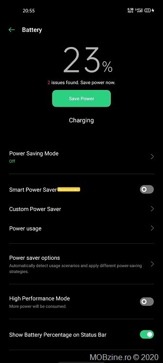 Primul lucru pe care vi-l recomand să îl faceți imediat ce porniți Oppo Reno3 Pro este să renunțați la setarea implicită Smart Power Saver. Scopul ei este acela de a vă maximiza autonomia, însă pentru asta veți plăti un preț mare: performanța și în foarte multe situații vă veți trezi că smartphone-ul se cam târâie și nu răspunde instant la comenzi.