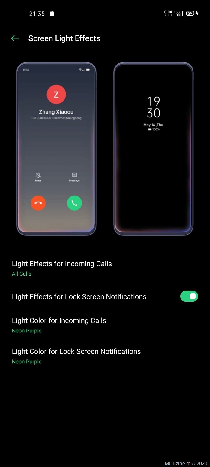 Puteți să activați în ColorOS efecte grafice pe ecran care să semnalizeze prezența notificărilor. Mergeți în Settings / Display & Brightness șiapoi Screen Light Effects.