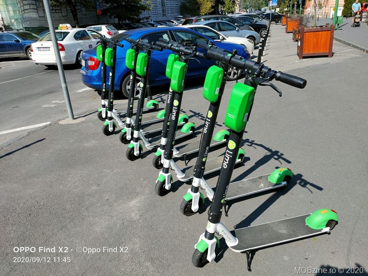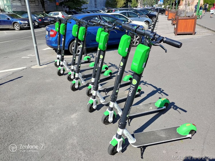 De data asta ceva mai simplu: niște trotinete electrice ce au umplut Brașovul zilele astea. Urmăriți culorile negru și verde de pe trotinete și cea albastră a mașinii. Apoi uitați-vă la lemanul suportului de flori și la asfalt.