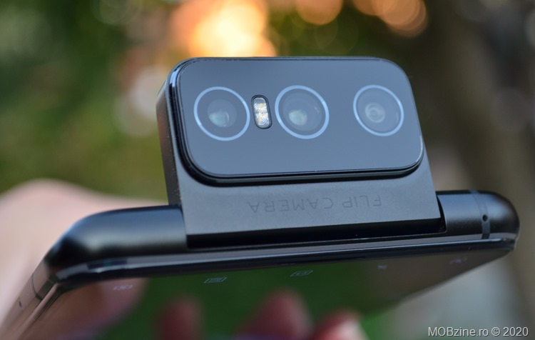 Mă bucur foarte tare că am reușit să prind în testul acesta și cel mai nou flagship Asus pentru că avem în față un aparat special: sistemul foto e creat din trei camere foto, combinate într-un dispozitiv rabatabil, ce permite surprinderea unui număr mare de unghiuri. Ideea asta de a face camera rabatabilă are o motivație evidentă: poți folosi camera principală și pentru selfie și în același timp îți permite să prinzi unghiuri pe care altfel ți-ar fi foarte greu să le iei cu smartphone-ul.