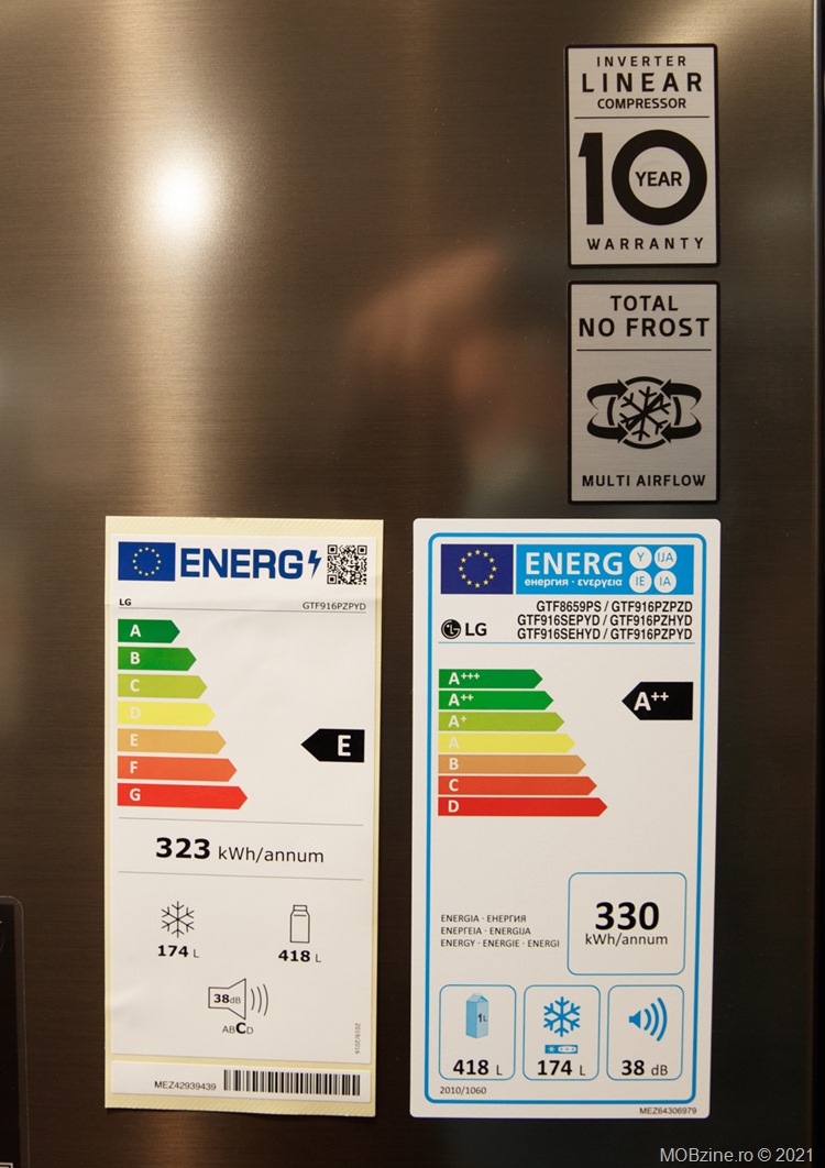 Dacă vă uitați atent pe noile etichete energetice o să vedeți că pe fiecare nouă etichetă se regăsește un cod QR, care odată scanat deschide o pagină web a Comisiei UE unde sunt înregistrate informații detaliate despre model. De exemplu pentru un frigider cu doua usi LG GTF916PZPYD, 592 l, Clasa A++, No Frost, WiFi, similar cu modelul pe care îl folosesc eu, avem următoarea etichetă energetică: