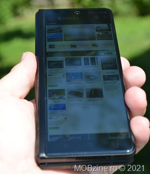 Și asta îmi aduce aminte de faptul că am sărit puțin cam repede peste acest aspect important: Samsung Galaxy Z Fold3 are două ecrane: primul, de 6.2 inci este dedicat folosirii atunci când smartphone-ul nu este pliat. Rezoluția sa (832 x 2268 pixeli) cu un raport 25:9 permite folosirea fără probleme a aparatului pe formatul ”clasic”. Răspunzi la apeluri, Social Media, email, foto fără niciun fel de probleme. Te obișnuiești rapid cu faptul că are un alt raport decât cel 21:9, să zicem standard în momentul de față. Majoritatea aplicațiilor sunt afișate fără niciun fel de problemă și în timp ajungi să te obișnuiești cu noul format, așa cum ai făcut-o de atâtea ori până acum, atunci când ai trecut la un nou smartphone.