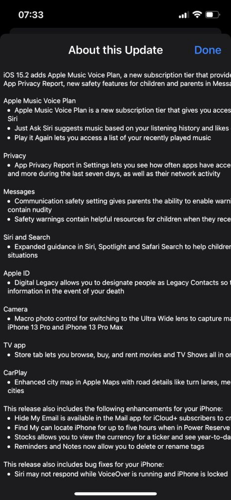Cam asta e iOS 15.2. Dați-i drumul la download dacă vreți să îl puneți acum (atenție, are vreo 860MB).