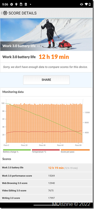 Conform testului de baterie din PC Mark, Motorola Edge 30 Pro are o autonomie de 12 ore și 19 pentru descărcarea de la 100% la 20%, una peste multe dintre flagship-urile de anul trecut.