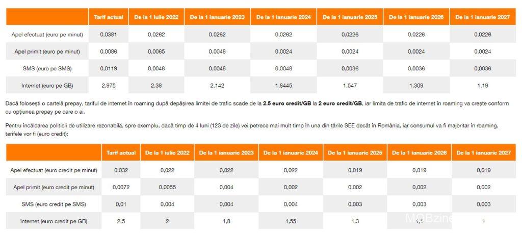 ”Vesti bune! Din 1.7.2022, conform noului Regulament de Roaming European, limita de net disponibil in roaming SEE fara cost suplimentar va creste, iar tariful pentru consumul suplimentar de internet in SEE scade de la 2,9 euro/GB la 2,38 euro/GB (TVA inclus). Se vor reduce si tarifele pentru incalcarea politicii de utilizare rezonabila, astfel (in euro cu TVA): 0,026/min pentru apeluri catre SEE, 0,0065/min pentru apel primit, 0,0047/SMS, 0,00238/MB. In plus, am completat clauzele referitoare la calitatea serviciilor in roaming si accesarea serviciilor premium in roaming astfel incat sa fii mai bine informat. Poti consulta informatii despre noile tarife si clauze in urmatoarea factura sau pe https://www.orange.ro/roaming/1iulie/”