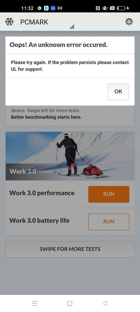 Am rulat totuși și testul de baterie din PCMark, pentru a avea un termen de comparație la nevoie. Din păcate, așa cum se poate vedea mai jos, testul nu a putut fi dus pana la capat. După trei încercari eșuate, am renunțat. La ultima am cronometrat, am depașit bariera de 15 ore. Însă în momentul în care bateria ajunge la 20%, apare eroarea.