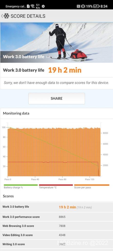 Pe de altă parte, autonomia este excelentă: puțin peste 19 ore pentru descărcarea de la 100% la 20% în testul PC Mark 3. Pot să vă spun că de foarte multă vreme nu am mai avut așa un rezultat bun pentru un smartphone de generație nouă – bineînțeles, testul a fost făcut cu luminozitatea dată la minim și rata de afișare dinamică. Toate astea se datorează unei baterii cu o capacitate de 4800 mAh, pentru care există și suport de încărcare rapidă Honor SuperCharge la 66W (în teorie de la 0 la 81% în doar 30 de minute).