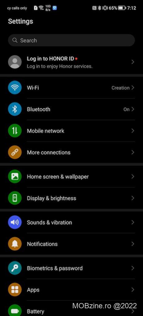 Imediat ce l-am pornit am remarcat că informația de pe display-ul IPS LCD de 6.81 inci (1080 x 2388 pixeli) se vede bine, iar dacă puneți strălucirea la nivelul maxim veți foarte mulțumiți de cum funcționează, atât în interior cât și în exterior. Uitându-mă prin meniu am văzut că Honor oferă rată de afișare variabilă, de până la 120 Hz pentru acest model. Deși merge să o blocați la 120 Hz, vă recomand să nu faceți asta dacă vreți să obțineți maximul de autonomie.