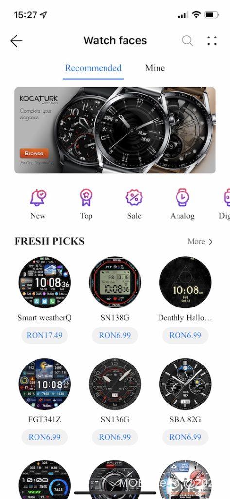Pentru că am ajuns aici trebuie să vă spun că folosirea ceasului Huawei Watch GT 3 Pro se face împreună cu aplicația Huawei Health instalată pe telefon (iOS și Android) și legarea telefonului prin Bluetooth. Din Huawei Health instalați aplicațiile necesare (sunt câteva interesante, eu m-am jucat cu player-ul radio), configurați temele pentru ecran (inclusiv cumpărați unele – am găsit câteva foarte faine la 5 – 18 lei).