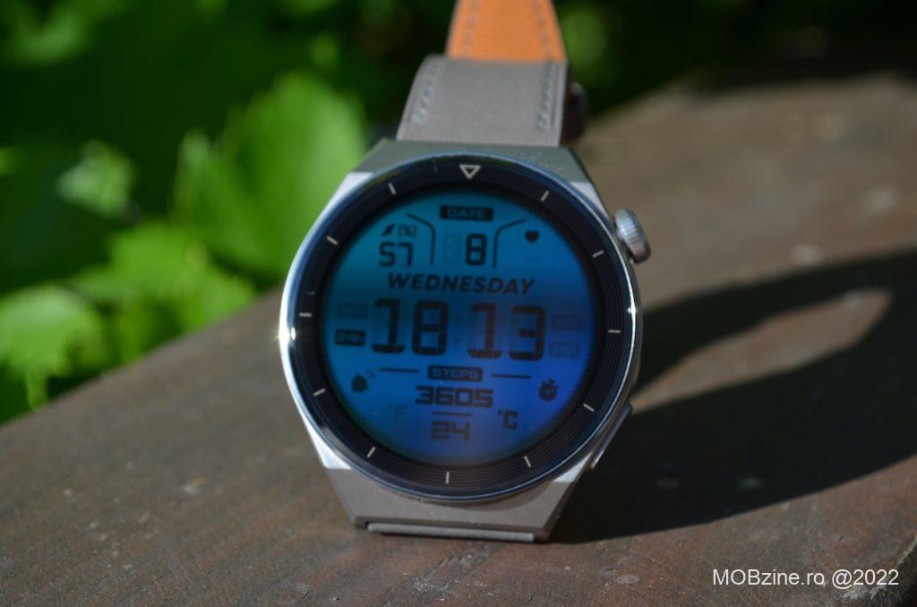 Watch GT 3 Pro are 46,6 mm x 46,6 mm 10,9 mm, fiind mai mic decât modelul Watch 3 Pro și în felul acesta mai puțin masiv, fiind însă mult mai performant și mai ușor de purtat. Mi-a plăcut Watch 3 Pro Classic, dar Watch GT 3 Pro Titanium este peste el din toate punctele de vedere: aspect, greutate, performanță, autonomie.