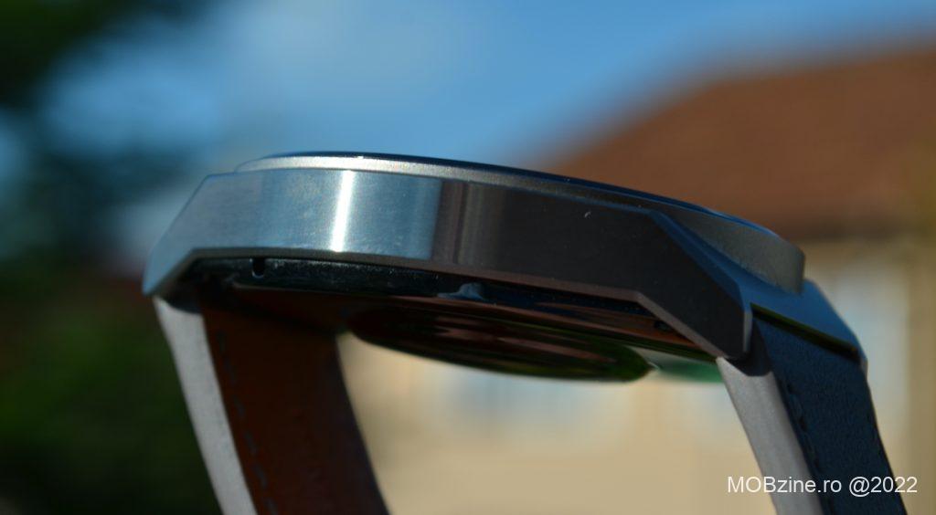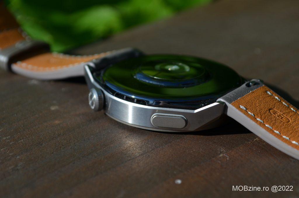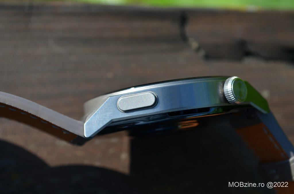 Construcția este una foarte solidă, cu linii proeminente și unghiuri care îl fac de neconfundat. Beneficiază de un buton de control și de o rotiță cu funcție dublă: navigație și buton. Cu toate că nu are opțiuni de blocare a ecranului, așa cum am văzut pe prima serie Huawei Watch GT, varianta GT 3 Pro activează foarte rar apăsările aleatoare – din păcate ele există și trebuie să fim în continuare atenți la ele.
