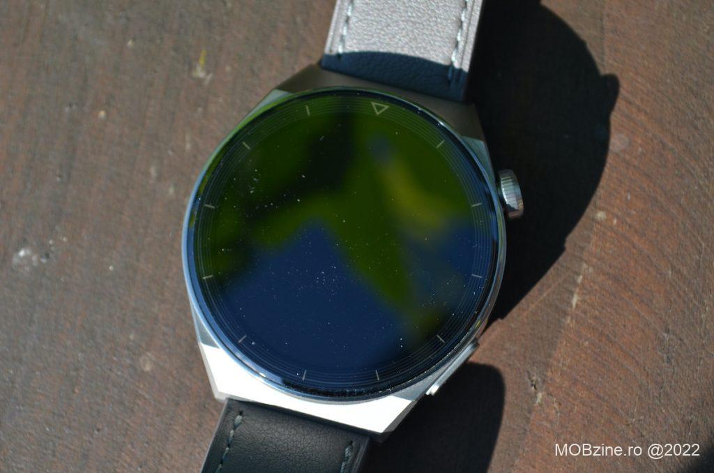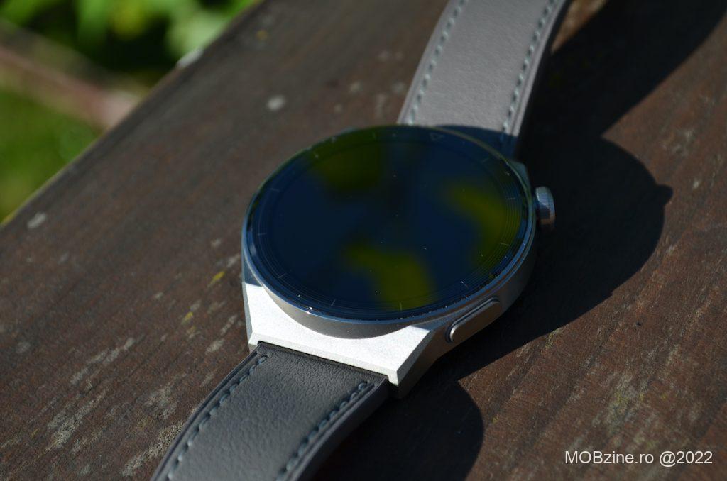 Ceasul smart are un display cu diagonala de 46,6 mm, fiind proiectat pentru persoanele cu o dimensiune a încheieturii mâinii cuprinsă între 140 și 210 mm. După cum am spus, nu este la fel de masiv ca Watch 3 Pro Classic, fiind puțin mai discret, dar mult mai puternic.