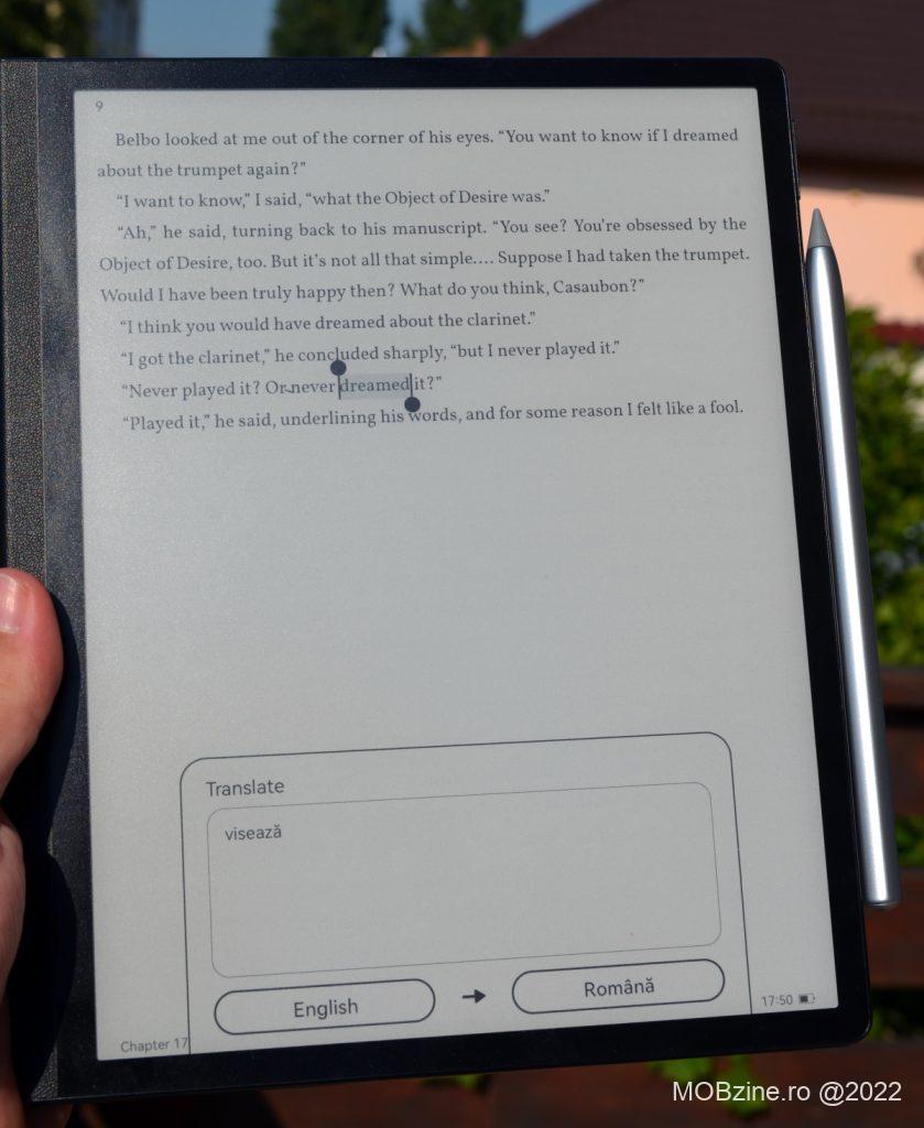Cu alte cuvinte posibilitățile de a citi materiale în format electronic sunt vaste, pe gustul oricui, platforma nefiind limitată la soluții proprietare. Că mi-am adus aminte, aplicația standard Book are două opțiuni interesante: posibilitatea de selecție și traducere a textului în mai toate limbile și schimbarea fontului și a dimensiunii sale.