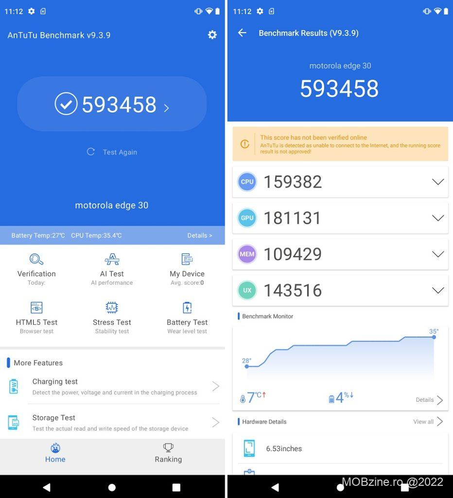 Vedem o configurație ce pare la prima vedere destul de completă și destul de puternică. Un prim reproș pe care i-l putem aduce lui Motorola Edge 30 este legat de lipsa slotului pentru card microSD. Noi am testat versiunea cu 8 GB de RAM și memorie internă de 128 GB (de culoare gri). Poate că nu este greu să te descurci doar cu 128 GB de stocare internă, dar cu siguranță stai cu grija spațiului de stocare.