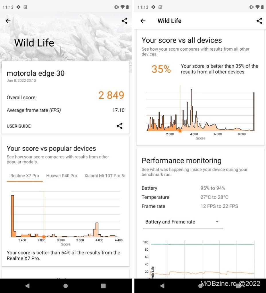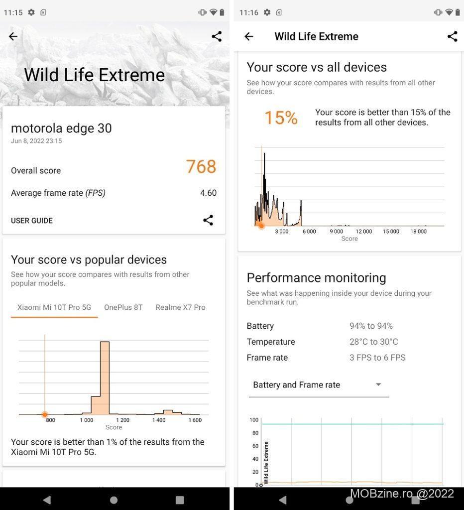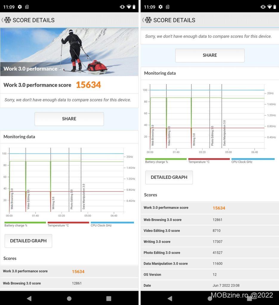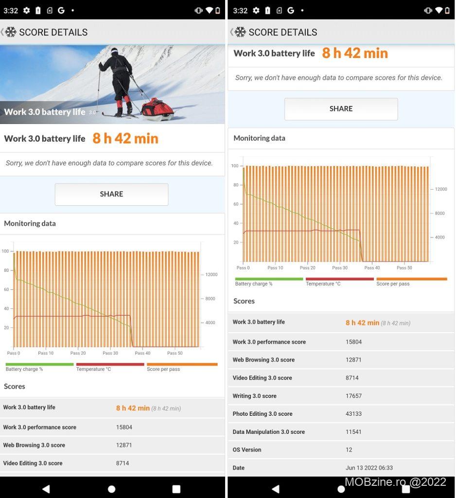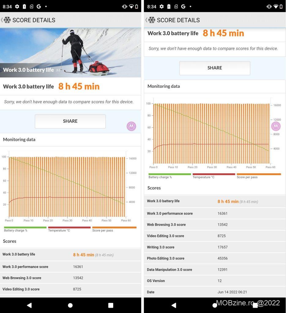 Am repetat testul de baterie din PCMark de trei ori, fără prea mare succes. Vedeți mai jos cele mai bune două rezultate. Pentru comparație, în aceleași condiții de testare, am avut telefoane tot de la Motorola, care au reușit și 22 de ore.