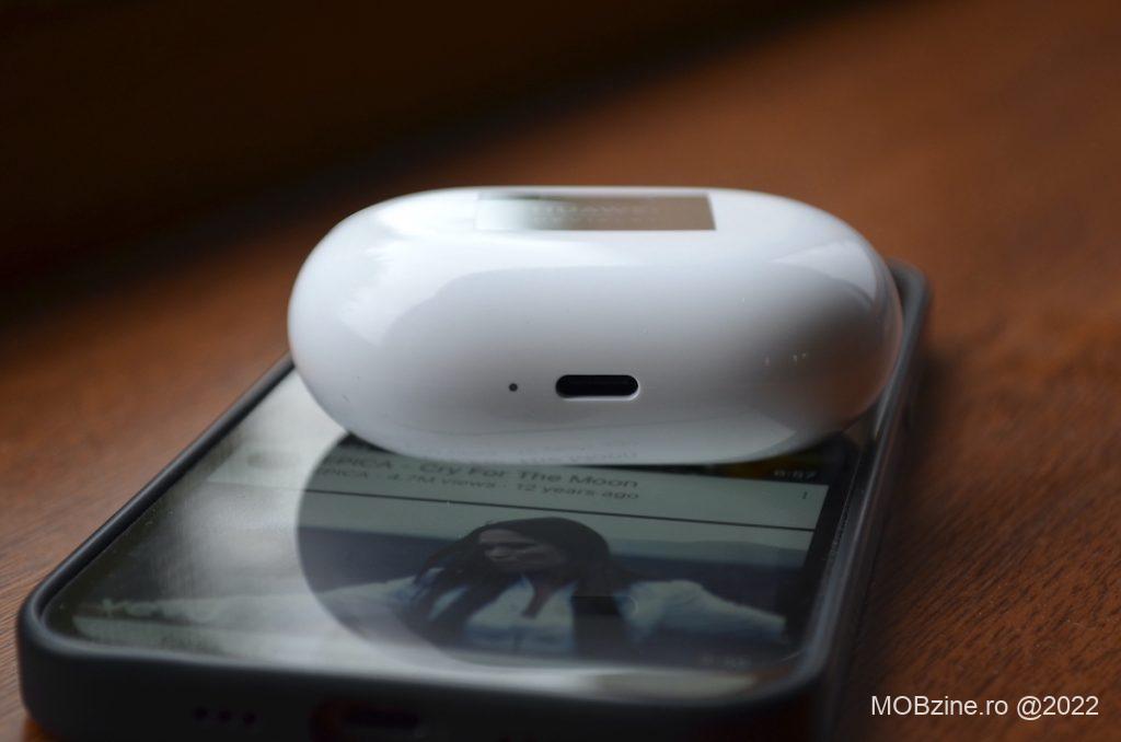Pentru transport și încărcare Huawei FreeBuds Pro 2 beneficiază de o cutie în format oval, care servește și suport de încărcare și baterie externă – în principiu, bateria din cutie permite 5 cicluri de încărcări complete ale ambelor căști (în 10 min puteți pune cam 15% baterie înapoi în căști).
