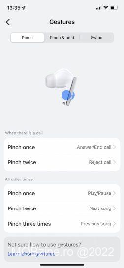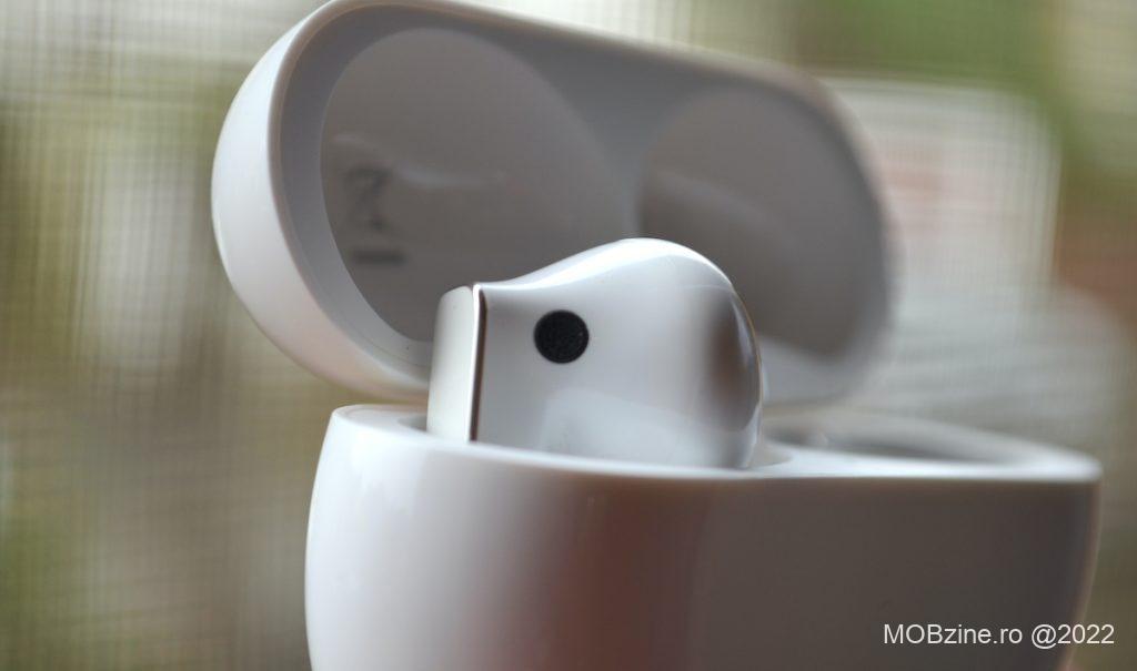 În același timp, vorbim despre un corp mai scurt, pe care sunt poziționați senzorii touch pentru control – am observat că operația de touch și pinch (apăsarea sub formă de pișcătură) merge mult mai bine decât eram obișnuit la seria FreeBuds 4i. Împreună cu funcțiile smart din aplicația AI Life a Huawei permit o varietate de elemente de control pentru stream-ul audio sau apelurile aflate în derulare.