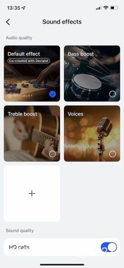 Revenind la algoritmi, se pot aplica efecte de sunet – sunt definite patru: Default, Bass boost, Treble boost și Clear Voice, iar cine vrea poate să își definească singur setările egalizatorului, pe 10 benzi. Implicit este setat cel realizat în colaborare cu Devialet. Gama de frecvențe pleacă de la 14Hz și poate merge până la 48 kHz.