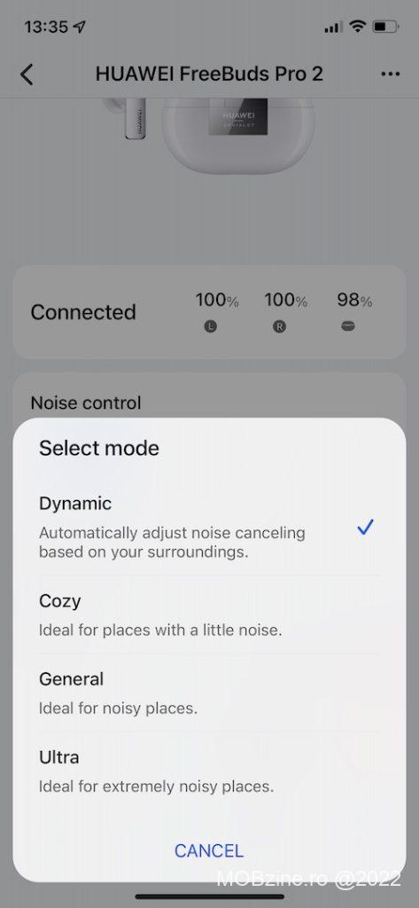 Iar un factor important aici este funcția de anulare activă a zgomotului, posibilă datorită celor trei microfoane puse pe fiecare cască în parte. Există funcția Dynamic, care ajustează automat optimizarea în funcție de zgomotul ambiental, sau se poate alege una dintre cele trei setări specifice: Cozy (pentru acasă, când nu e prea mare scandal în zonă), General (locuri mai zgomotoase) și Ultra (pentru acele situații unde zgomotul este foarte puternic – Huawei recomandă această setare pentru folosirea în avion, de exemplu).