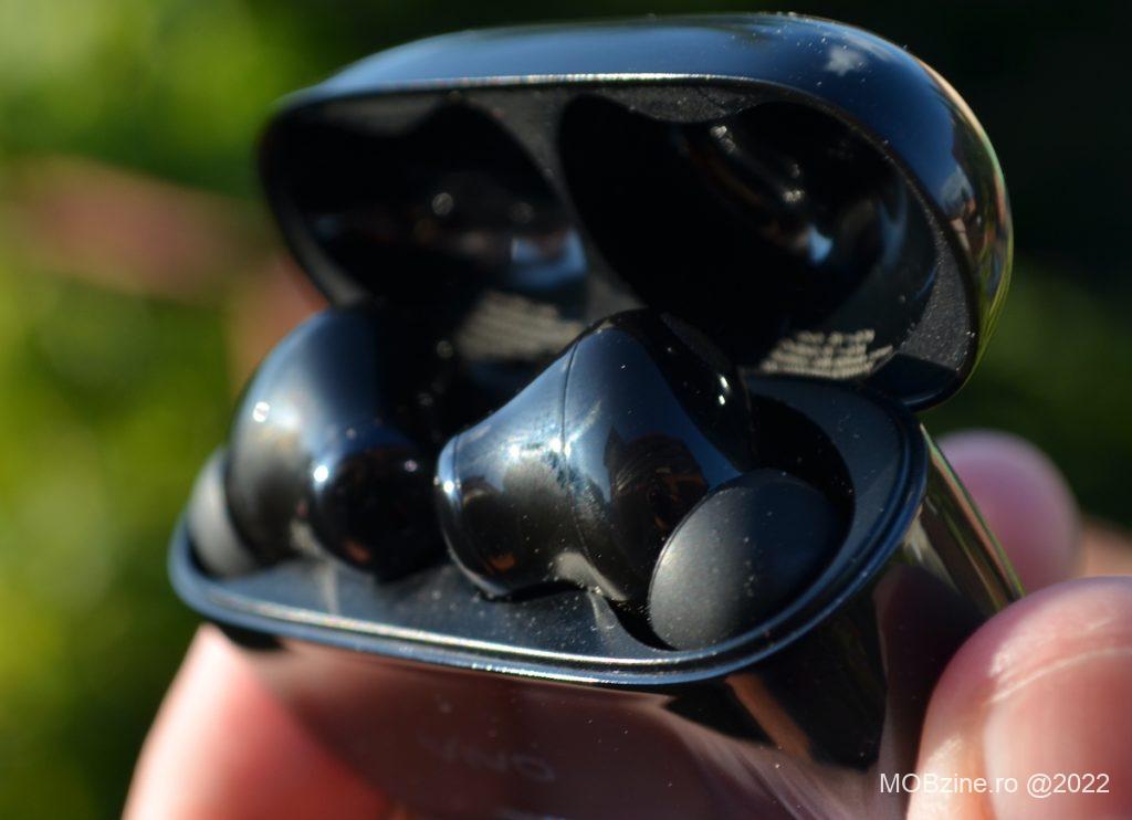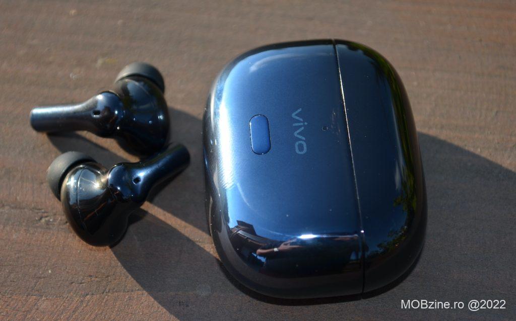 Revenind la căști, acestea au opțiunea de control touch pe picioruș, lucru pe care deja îl au toate căștile wireless de peste un anumit preț. Dimensiunea este de 23.8 x 22.2 x 30.2 mm, cântărind aproape 4.7 grame pe fiecare cască. Aceste specificații le aduc foarte aproape de cele ”standard” pentru un set de căști de acest gen, semn că vivo și-a făcut bine treaba aici.