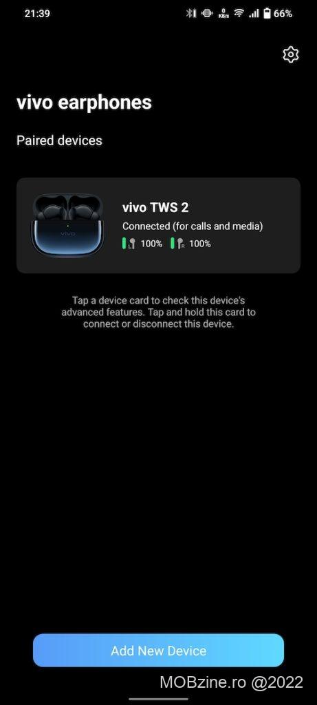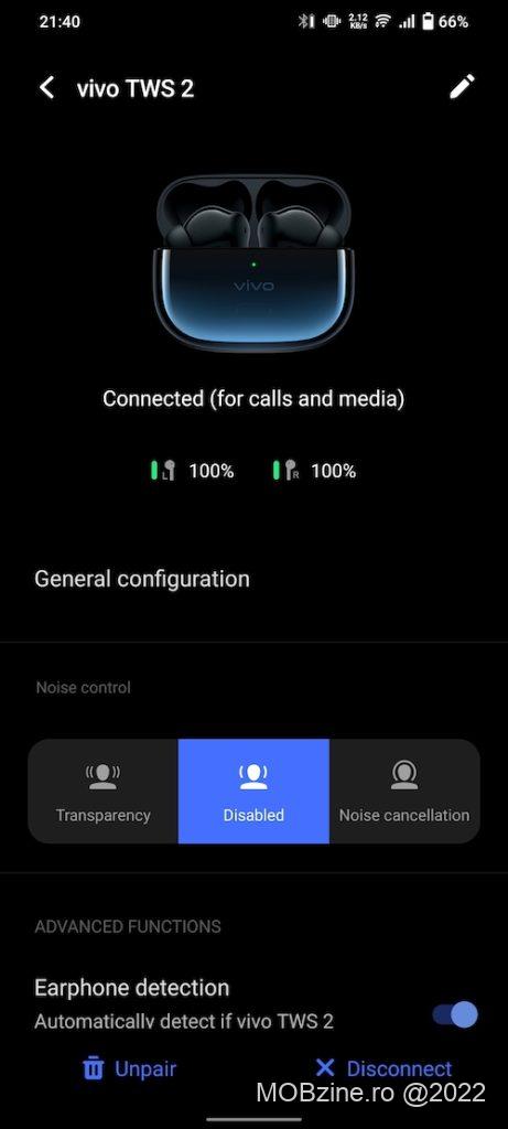 Apropo de asta, vivo spune în specificații că TWS 2 ANC au o bobină de 12,2 mm care poate reda gama de frecvențe de la 20 Hz la 20000 Hz, cu codec-urile aptX Adaptive/AAC/SBC și latență de 80 ms. În plus există și senzori capacitivi și căștile au funcție de detecție a purtării lor în ureche, care va opri automat stream-ul audio dacă vi le dați jos.