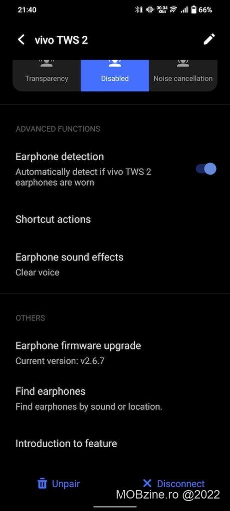 Pentru utilizatorii Android vreau să amintesc că vivo TWS 2 ANC pot fi legate de Google Assistant (apăsare de două ori pe piciorul căștii) pentru trimiterea de comenzi vocale. Iar în cazul în care pierdeți căștile (sau doar una dintre ele) există funcția de localizare ce poate fi folosită dacă respectiva cască este în raza de acoperire a conexiunii Bluetooth, permițând trimiterea unui sunet de intensitate mare, prin care să putem localiza gadget-ul.