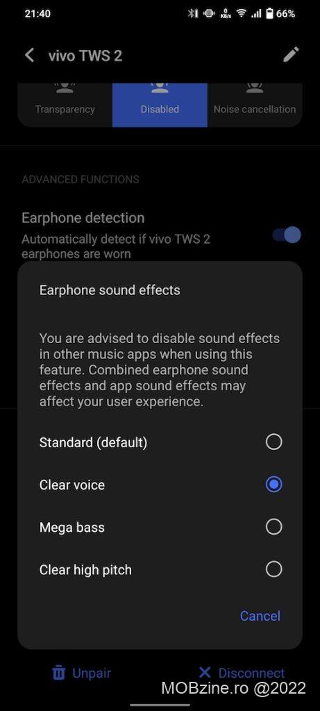 Funcțiile standard permit folosirea căștilor cu anulare activă a zgomotului pornită, cu ea oprită și în modul transparent, în care sunt lăsate ambientale să intre. Se pot adăuga efecte: voce, mega bass și clear high pitch, dar nu e posibil ca setările să fie ajustate manual.
