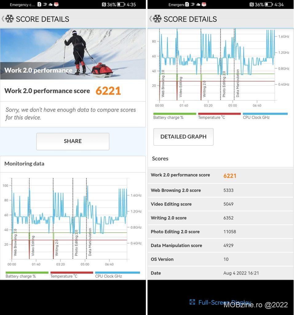 Un al doilea argument mare în favoarea acestui telefon, după prețul de vânzare, este autonomia. Aici oricum aveam așteptări de la o baterie de 6000 mAh. Și acestea nu au fost înșelate. Din păcate nu pot să vă arăt rezultatele din testul de baterie din PCMark, pentru că telefonul iese din aplicație brusc în momentul în care testul rulează de 16 ore. Am verificat de două ori, se întâmplă fix același lucru. Una dintre problemele cu aplicațiile descărcate prin Petal Search.