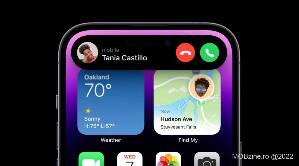 O să încep cu ceea ce mi-a plăcut mie cel mai mult: Dynamic Island. Este un element de interfață desenat pe notch, al cărui rol este să prezinte notificările într-un mod dinamic. Și cred că Apple a reușit să facă asta chiar foarte bine. Zona este personalizabilă pentru fiecare aplicație în parte – am văzut de dimineață un demo în care cineva se uita la un film în Dynamic Island pentru simplul fapt că se poate.